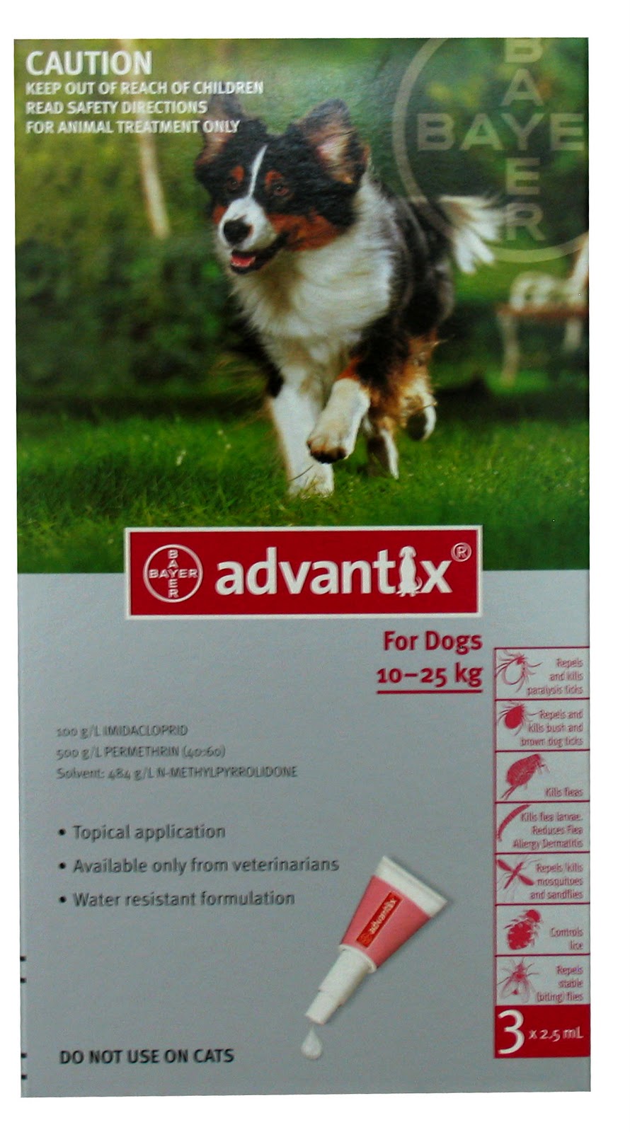 A associação entre duas substâncias activas (imidaclopride+permetrina) confere-lhe uma eficácia superior. Graças ao efeito insecticida e repelente diminui, substancialmente, o risco de transmissão das doenças vectoriais aos cães (ex: borreliose, leishmaniose, etc.).