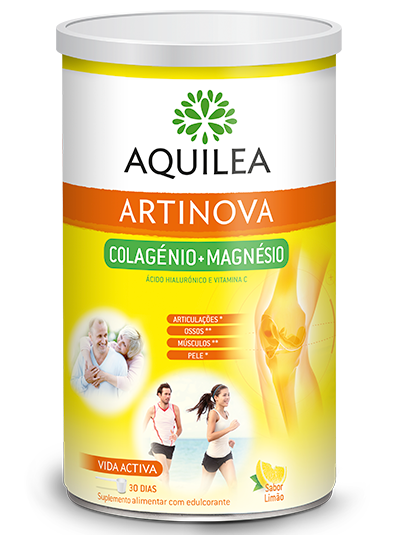 Aquilea Artinova Colagénio+Magnésio contém Colagénio, Ácido hialurónico, Magnésio e Vitamina C que contribui para a normal formação de colagénio para o funcionamento normal da cartilagem, o que contribui para o bem-estar das articulações.