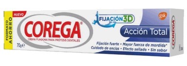 Além disso, possibilita a fixação da prótese dentária durante todo o dia, impede a entrada de restos de alimentos entre as gengivas e a prótese, e protege as suas gengivas da irritação. Com Corega® Ação Total poderá apreciar todo o tipo de alimentos como fazia anteriormente.