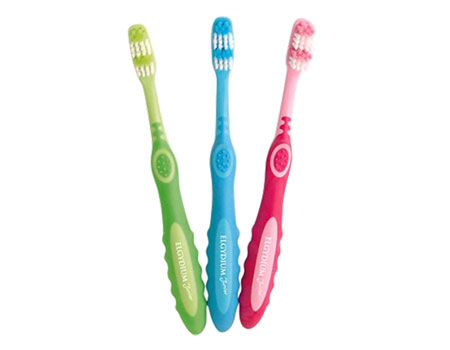 Design adaptado à idade. Cabeça adaptada. Cerdas suaves. Cabo ergonómico.
