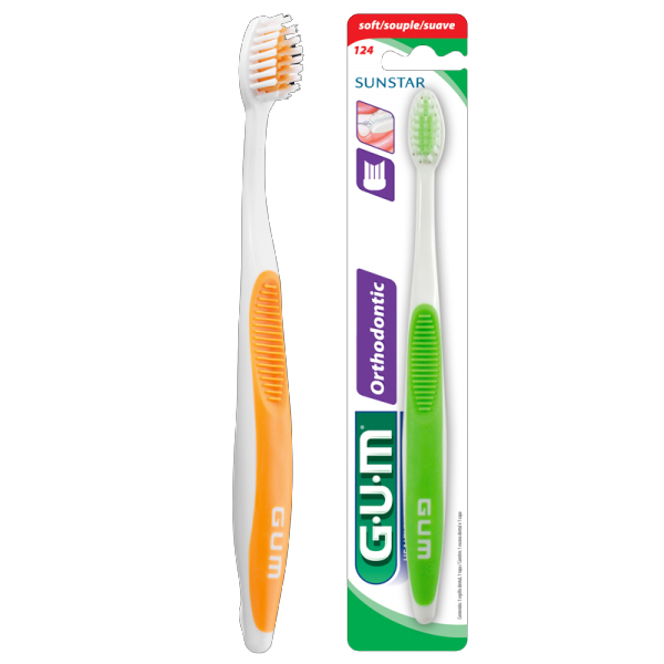 A escova de dentes GUM® Orthodontic foi desenvolvida para escovar de forma segura e eficaz os dentes com aparelhos ortodônticos, incluindo correias, suportes, tubos, e fios.