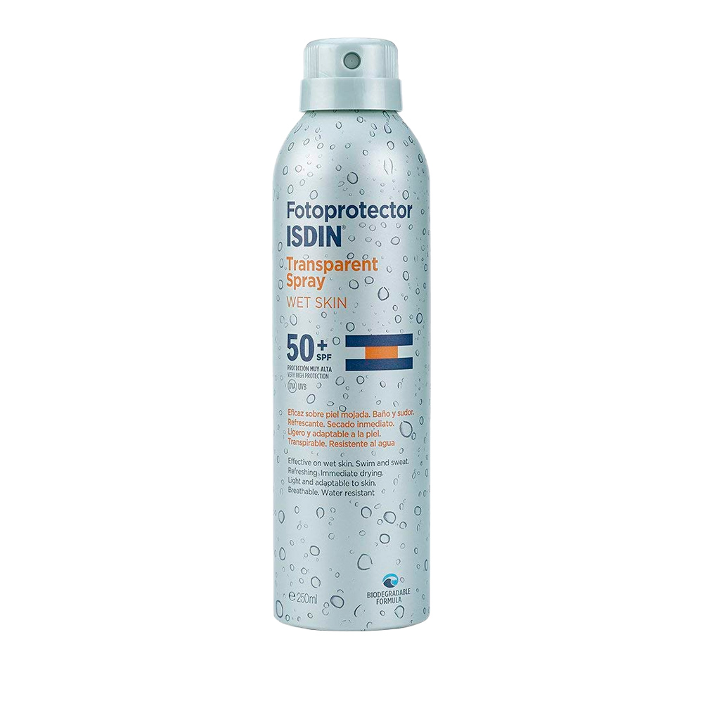 Fotoprotector ISDIN Transparent Spray Wet Skin SPF 50+ é um protetor solar em spray, transparente e refrescante, especificamente desenvolvido para ser aplicado tanto em pele molhada como em pele seca.