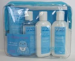 A bolsa Primeiros Cuidados do Bebé da Uriage inclui um 1er Change, uma pasta de água termal que previne o eritema da fralda, uma 1ère Eau, que permite fazer uma higiene do corpo, rosto, mãos e rabinho do seu bebé sem enxaguamento, um 1er Lait Hydratant, que suaviza e hidrata a pele do bebé, e um Creme Lavante, para a higiene do couro cabeludo e corpo no banho do bebé.